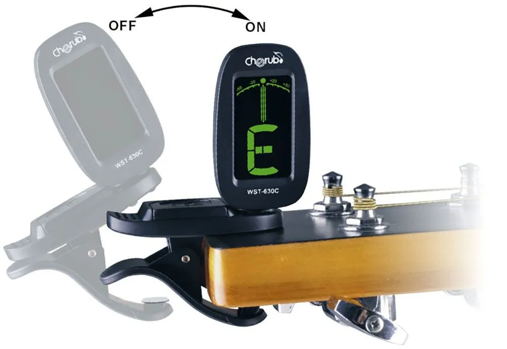 После того, как тюнер фиксируется на головке грифа инструмента, он включается автоматически, и автоматически выключается после снятия.