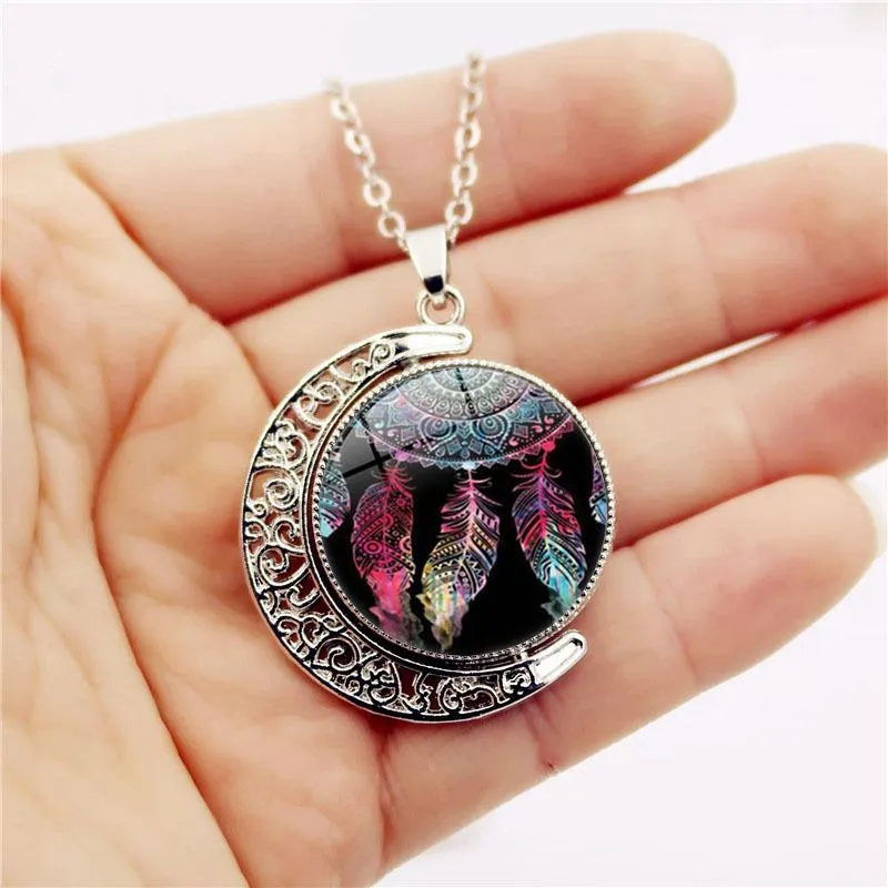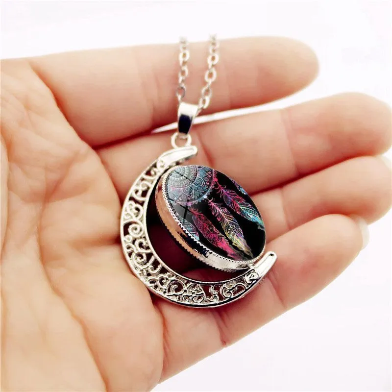 Кулон на цепочке Месяц. Вращающийся круг с перышками. Цвет серебро.