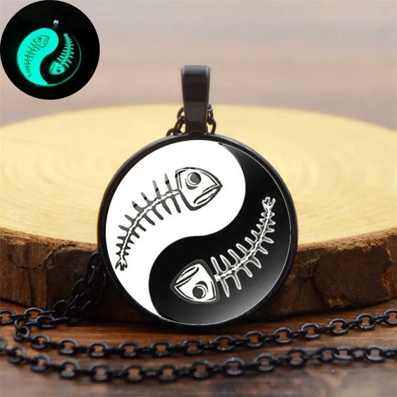 Кулон с цепочкой Инь Янь скелеты рыб. Светится в темноте. Цвет черный.