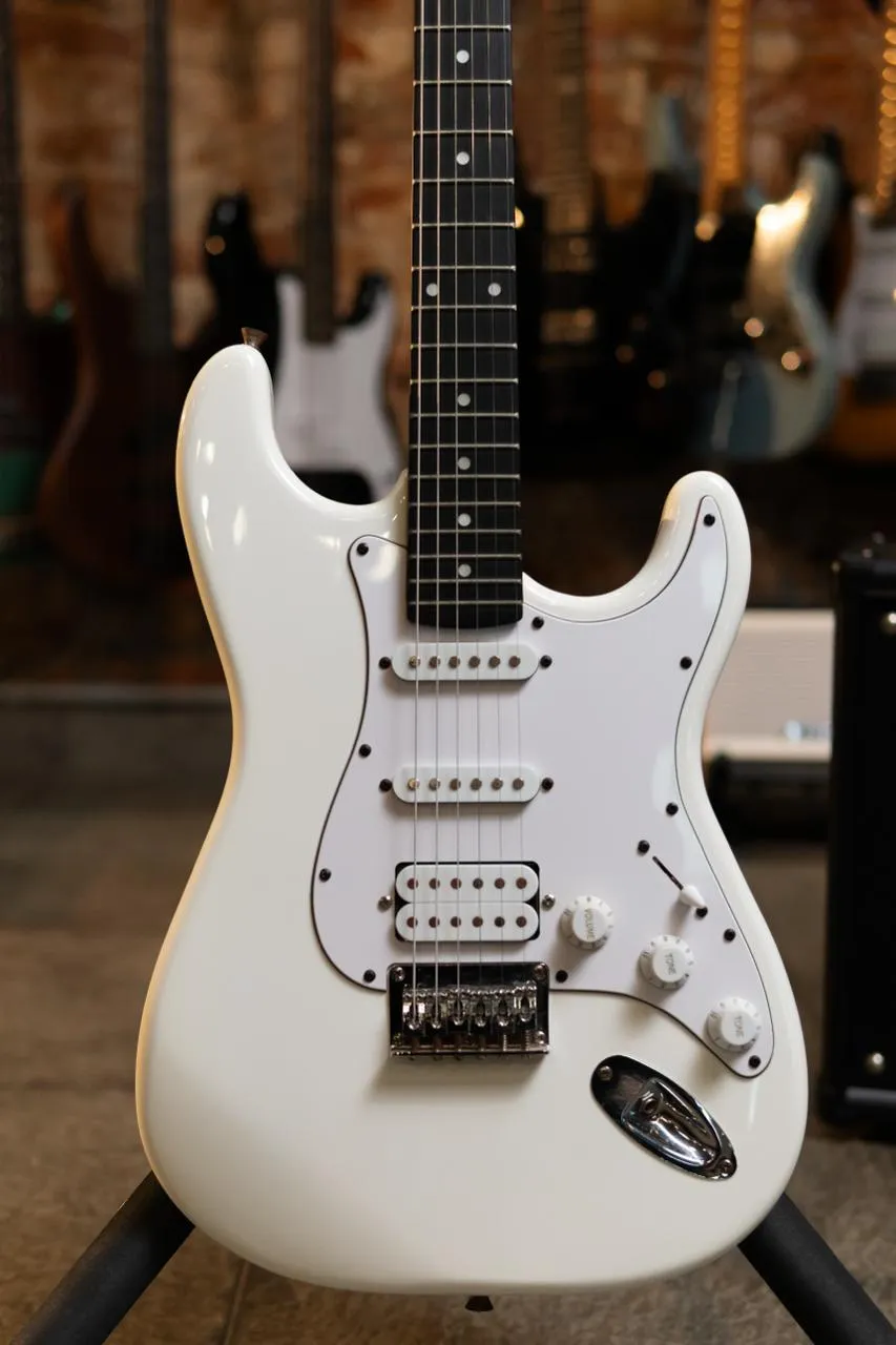 Цвет белый. Глянцевое покрытие. Материал корпуса тополь. Материал грифа клен. Анкерный стержень. Накладка грифа из древесно-полимерного композита. Хромированная фурнитура. Конфигурация звукоснимателей H-S-S. Управление звуком: громкость, 2 тембра, пятипозиционный переключатель.